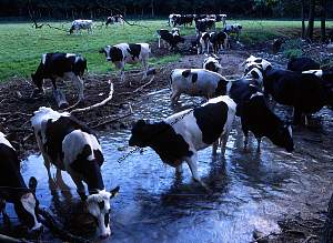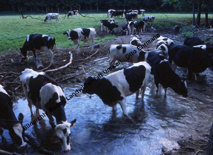 Schwarzbunte Rinder am Bach