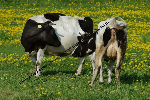 Kuh mit Kalb auf Weide